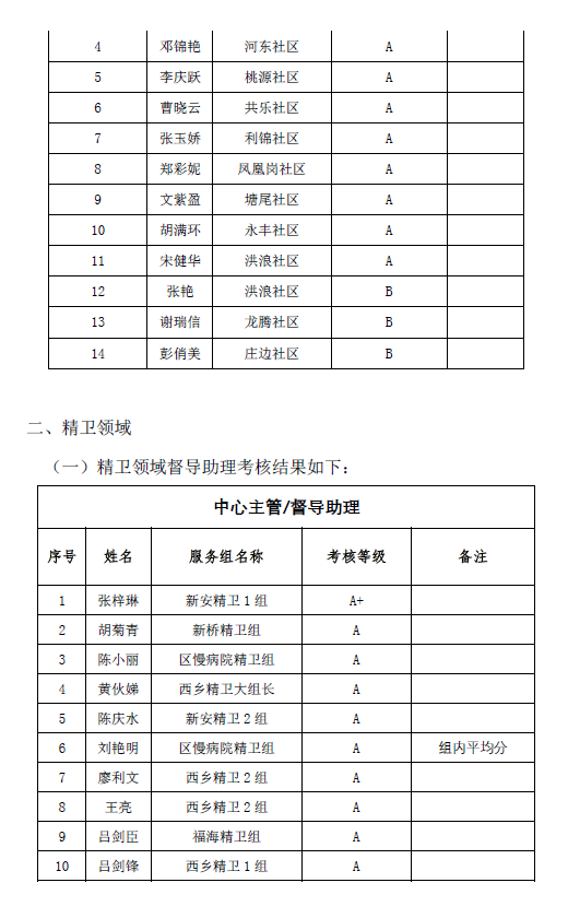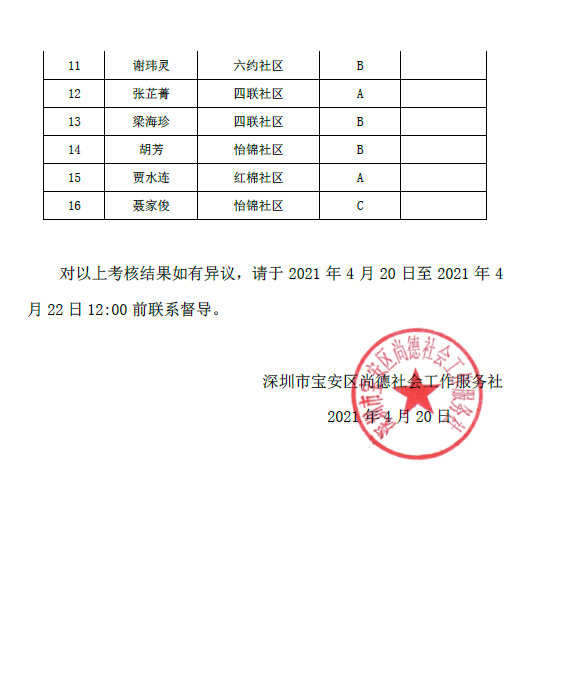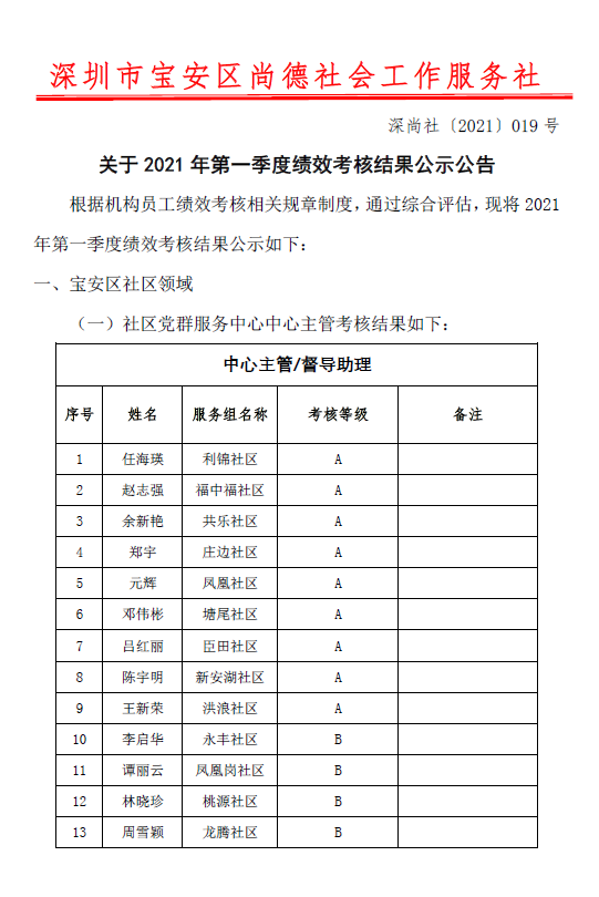 深尚社〔2021〕019号 关于2021年第一季度绩效考核结果公示公告