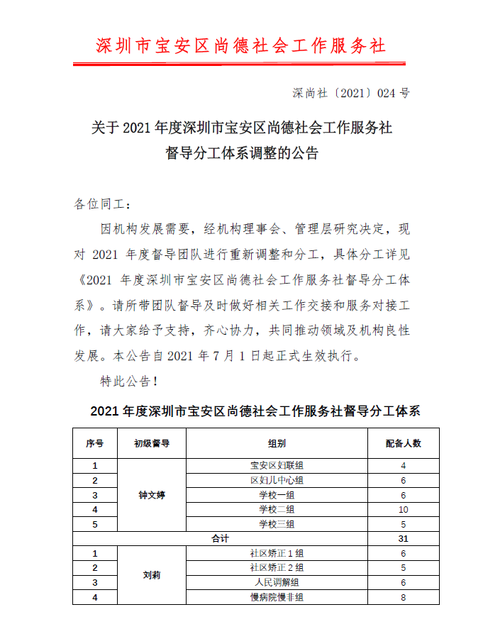 深尚社〔2021〕024号 关于2021年度深圳市宝安区尚德社会工作服务社督导分工体系调整的公告