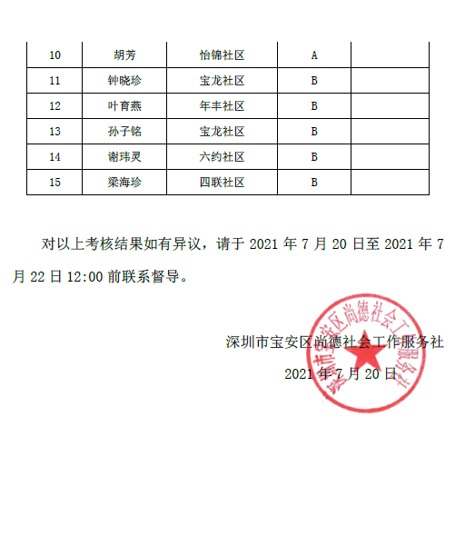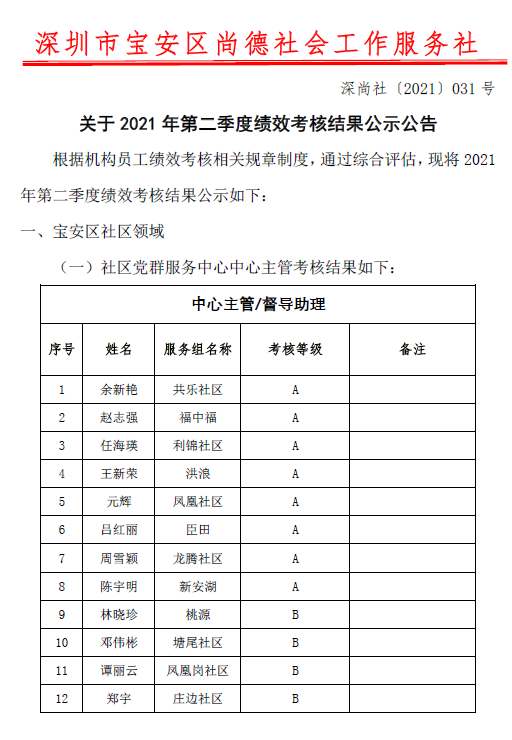 深尚社〔2021〕031号 关于2021年第二季度绩效考核结果公示公告