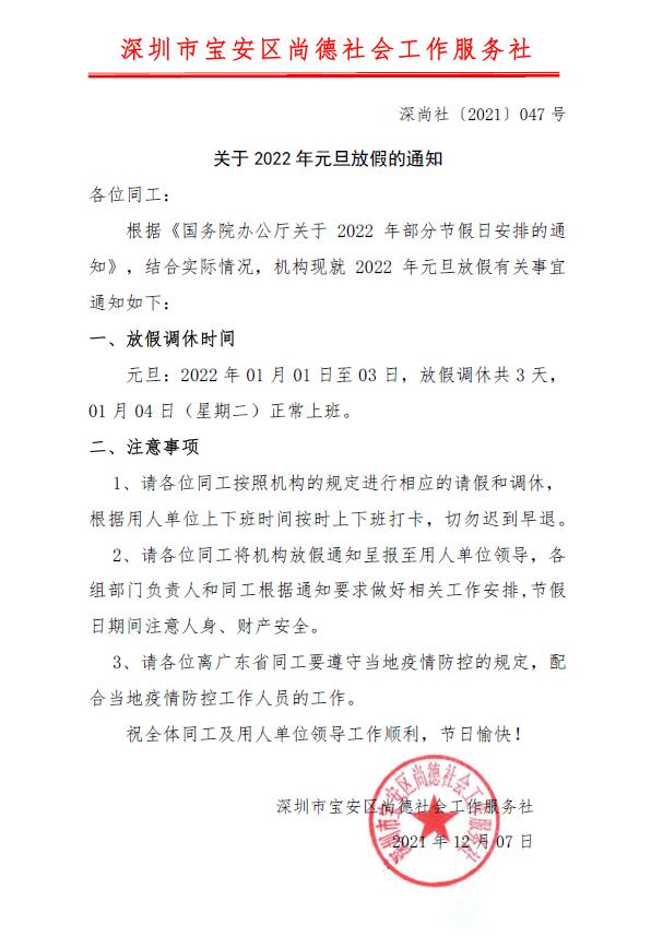 深尚社〔2021〕047号 关于2022年元旦放假的通知