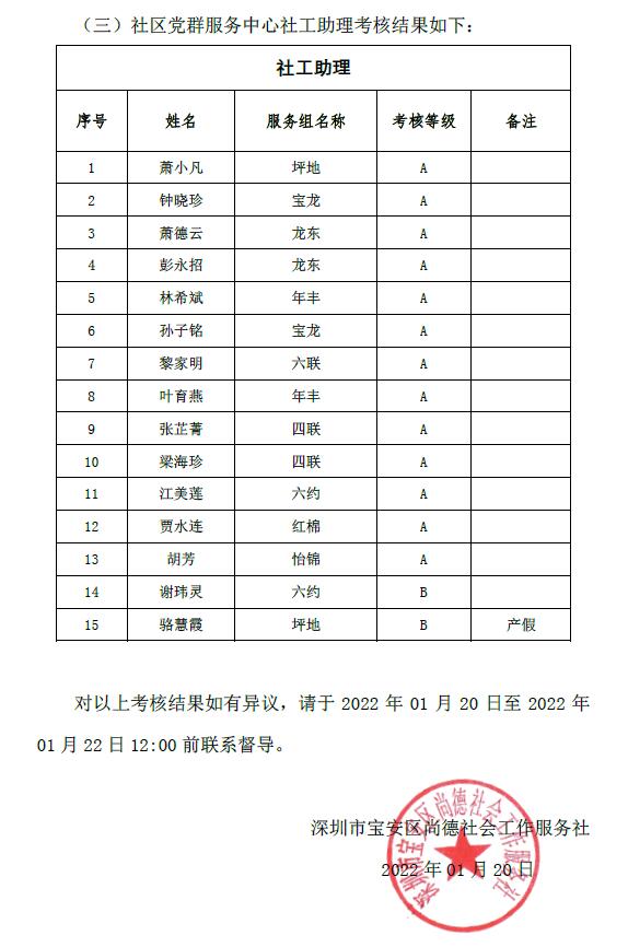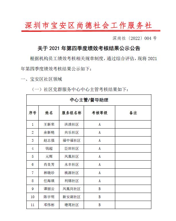 深尚社〔2022〕004号 关于2021年第四季度绩效考核结果公示公告