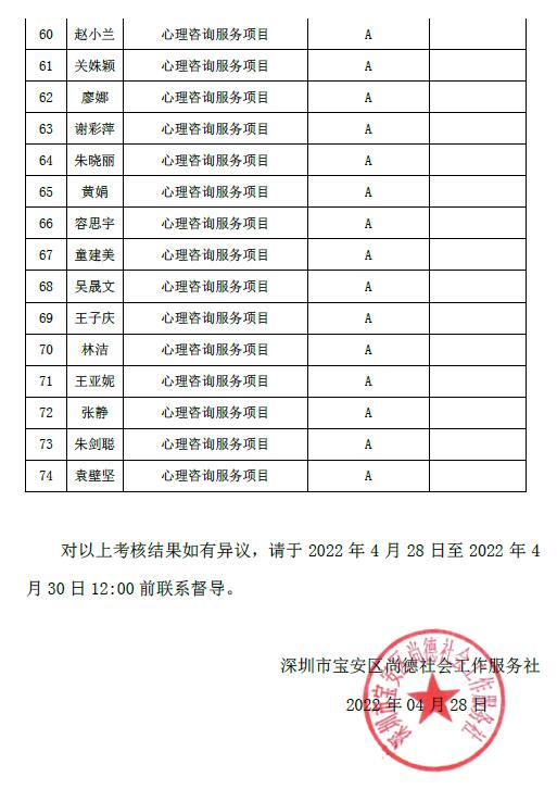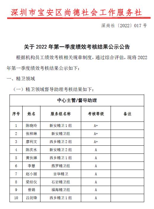 深尚社〔2022〕017号 关于2022年第一季度绩效考核结果公示公告