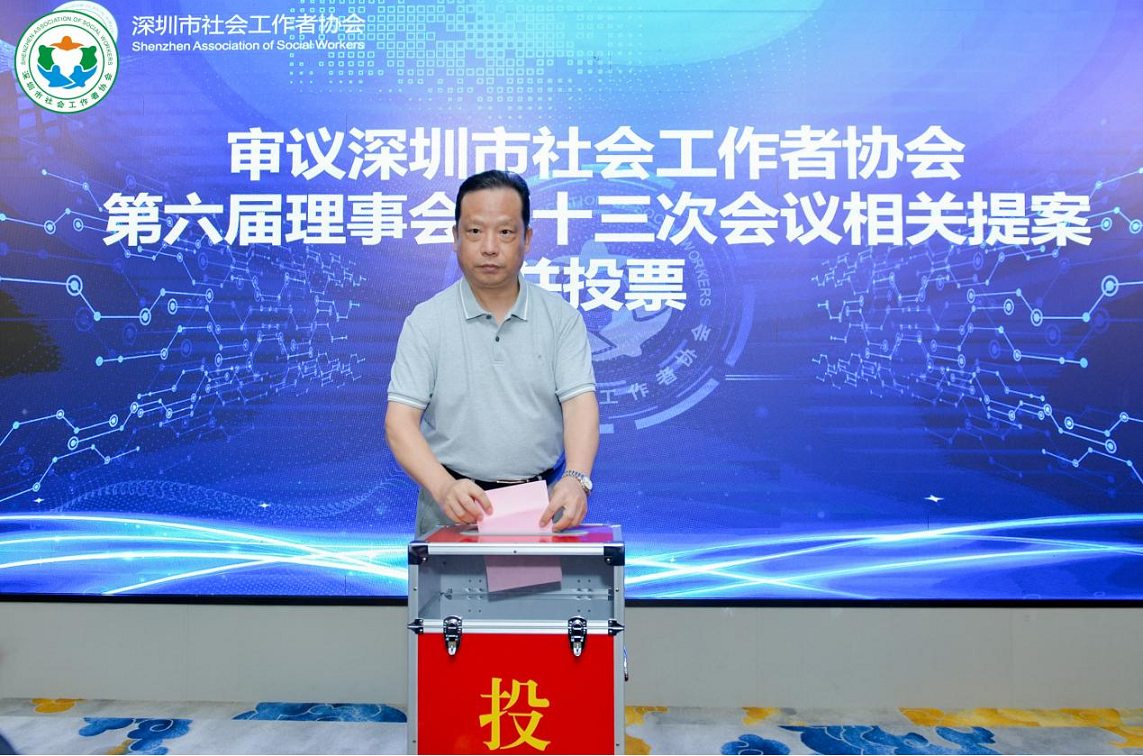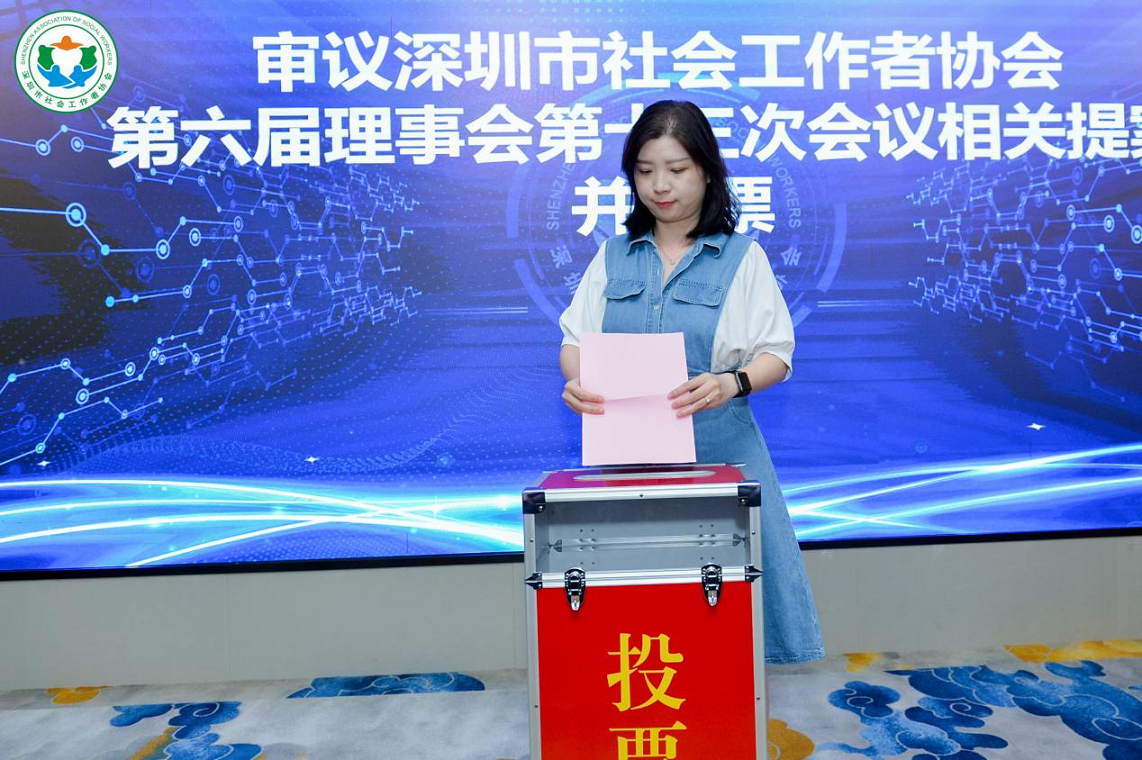 深圳市宝安区尚德社会工作服务社的理事长江秋文、初级督导陈义双、张意,参与审议深圳市社会工作者协会第六届理事会第十三次会议相关提案并投票。