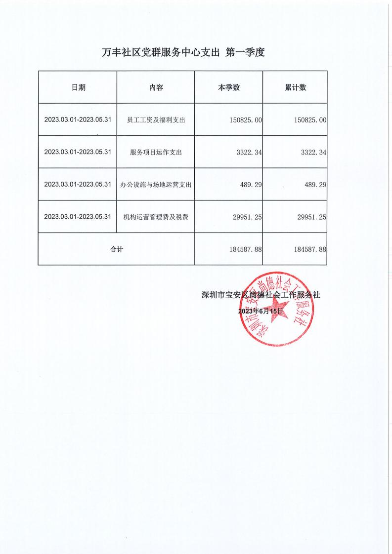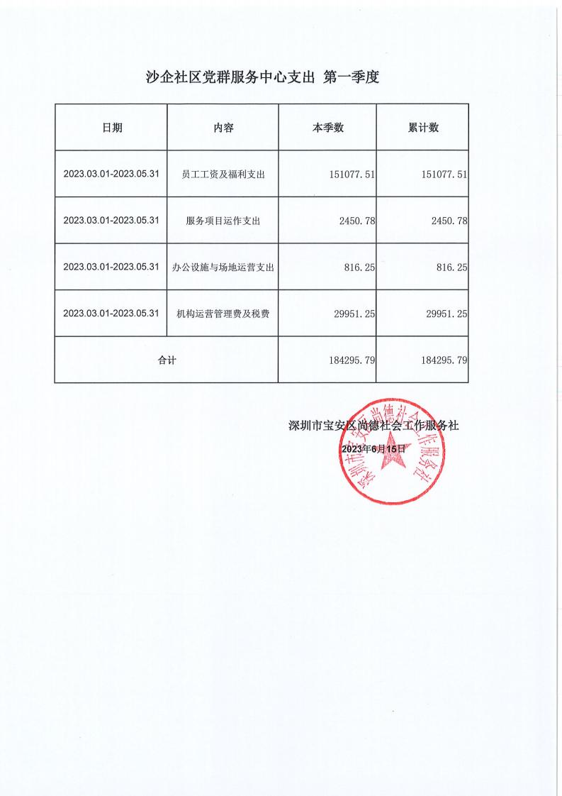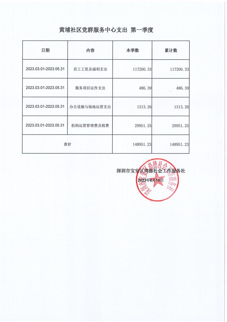 关于深圳市宝安区尚德社会工作服务社宝安区新桥街道黄埔、沙企、万丰、象山社区党群服务中心支出第一季度的公示