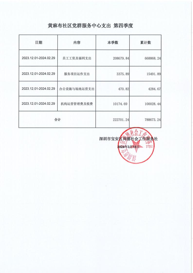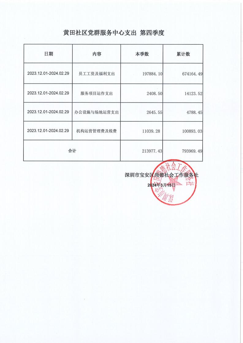 关于深圳市宝安区尚德社会工作服务社宝安区航城街道黄麻布、黄田、利锦社区党群服务中心支出第四季度的公示