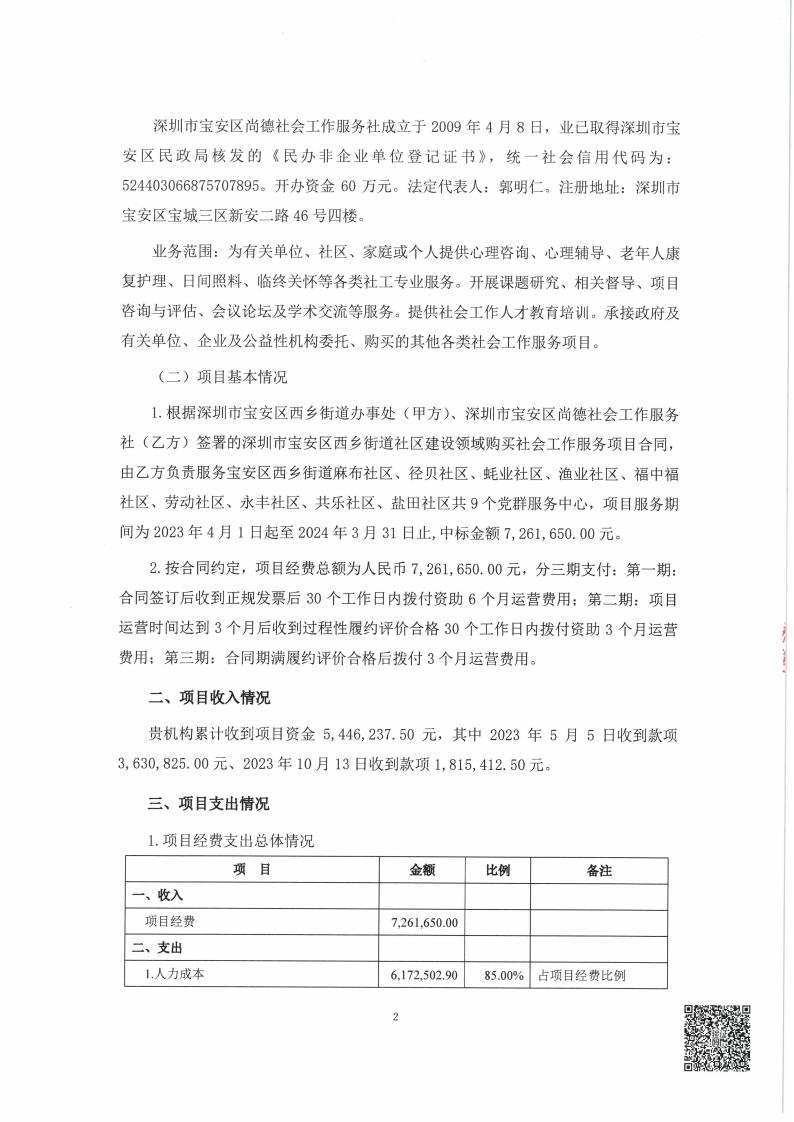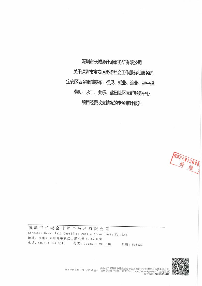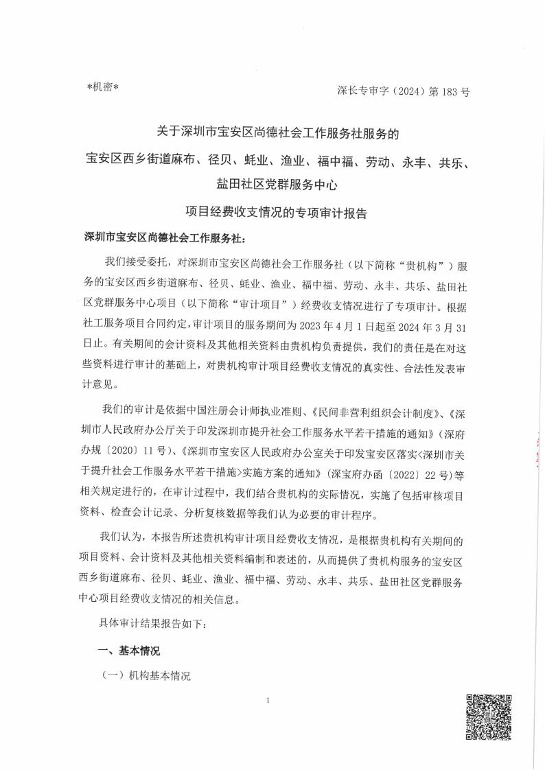 关于深圳市宝安区尚德社会工作服务社服务的宝安区西乡街道麻布、径贝、蚝业、渔业、福中福、劳动、永丰、共乐、盐田社区党群服务中心项目经费收支情况的专项审计报告