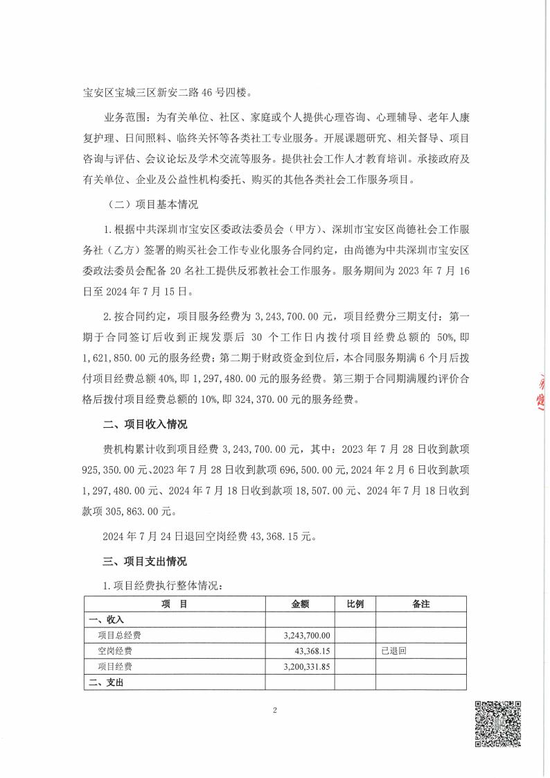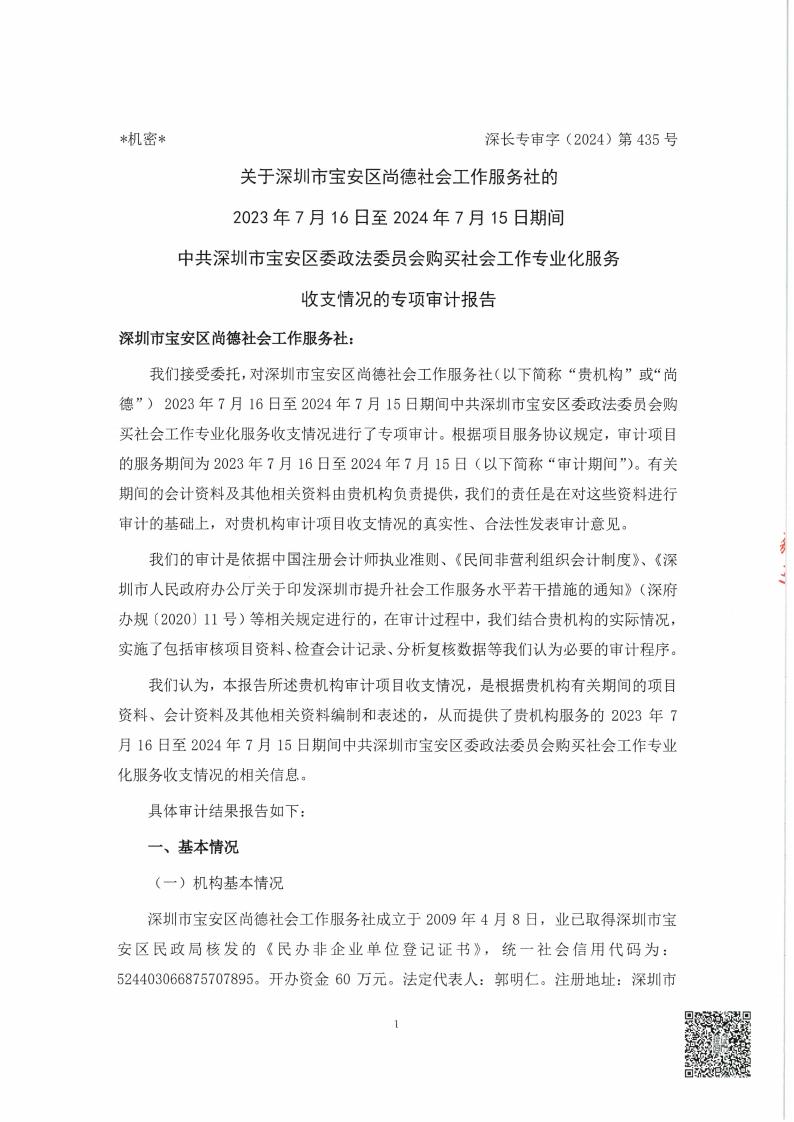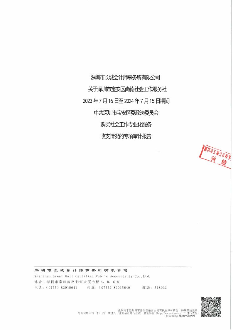 关于深圳市宝安区尚德社会工作服务社宝安区委政法委员会 购买社会工作专业化服务 收支情况的专项审计报告
