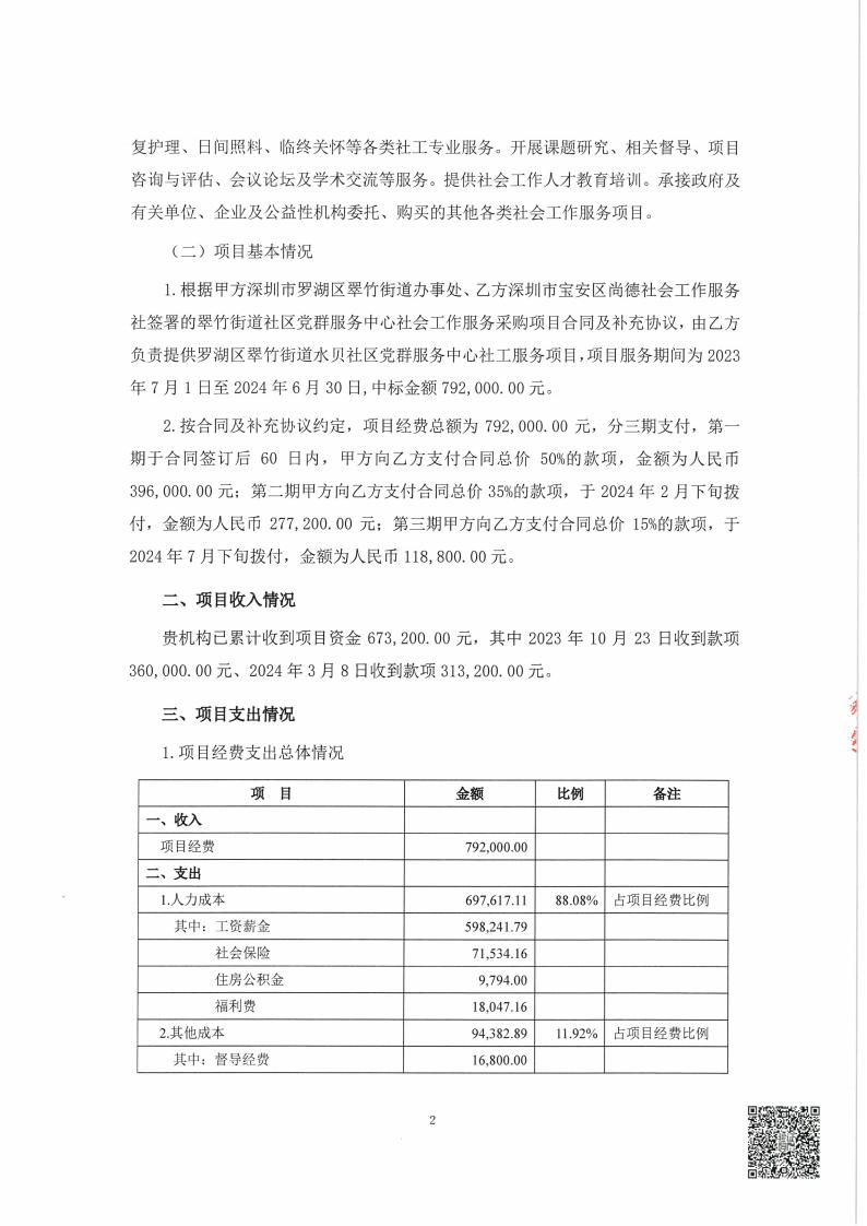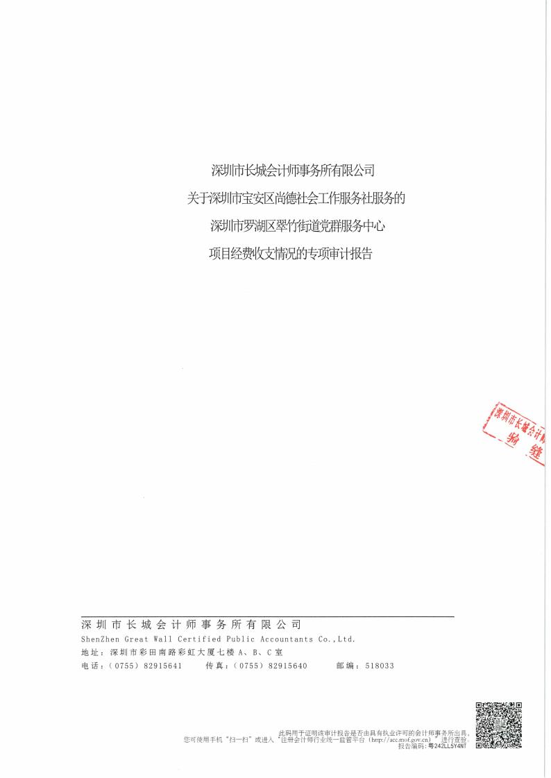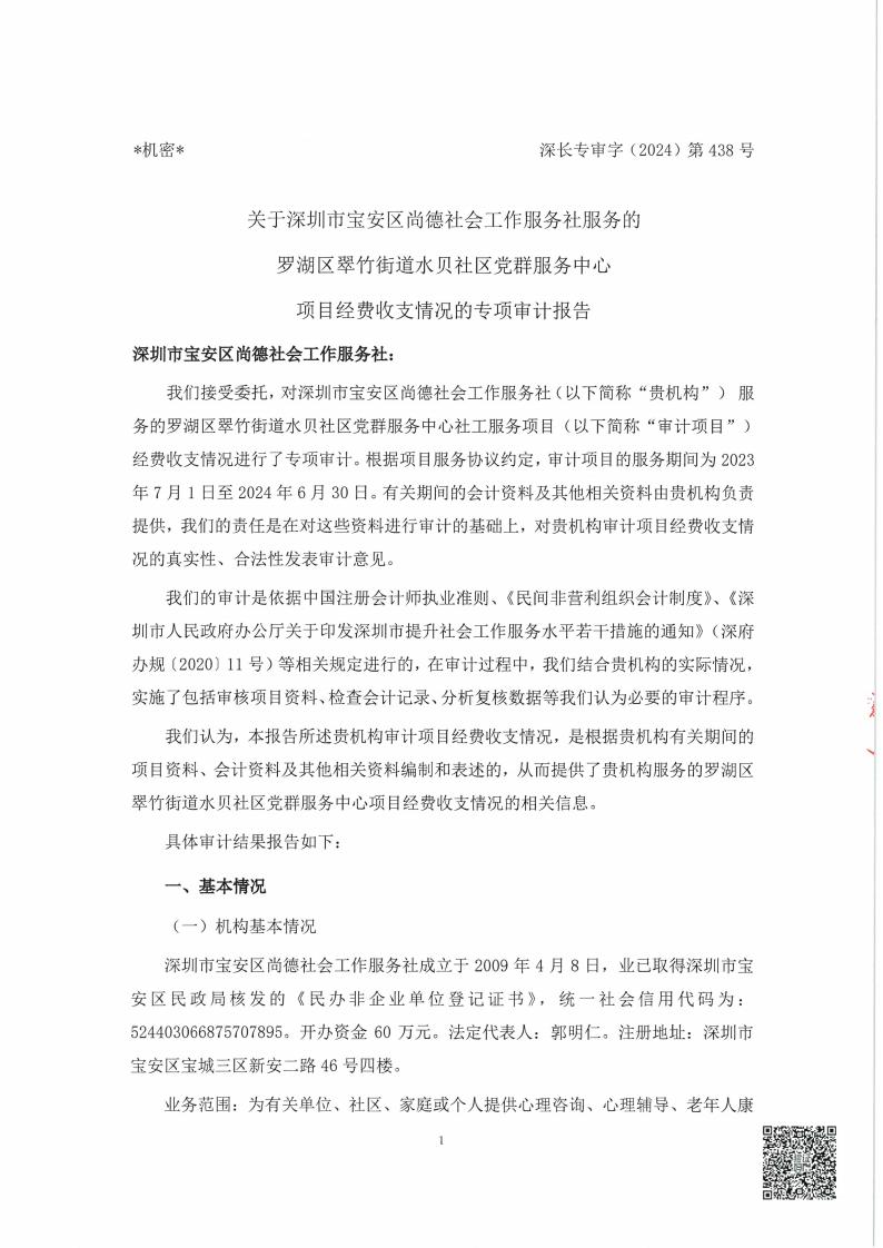 关于深圳市宝安区尚德社会工作服务社服务罗湖区翠竹街道党群服务中心项目经费收支情况的专项审计报告