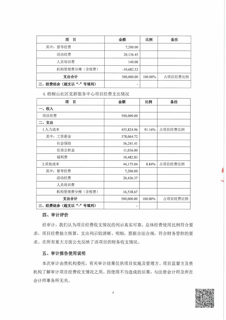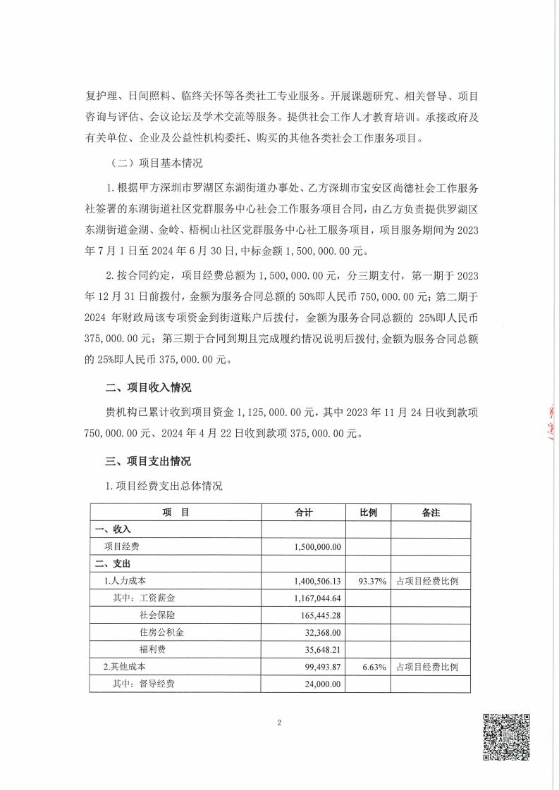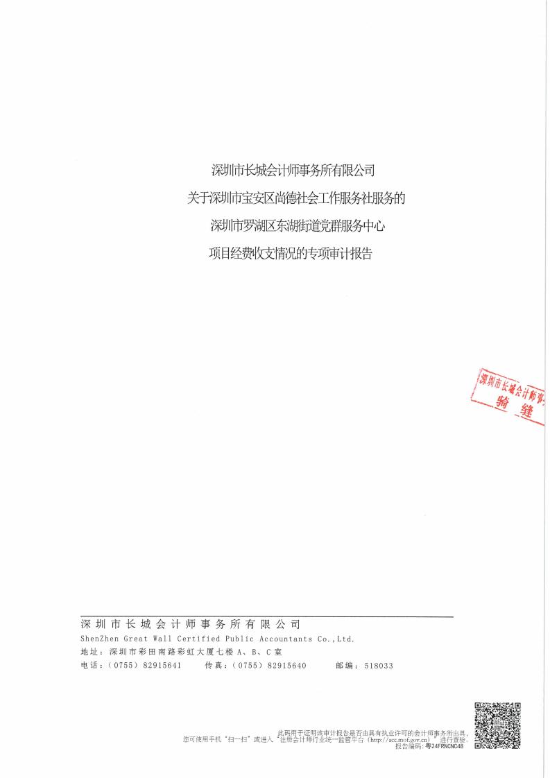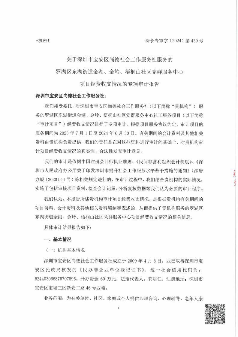 关于深圳市宝安区尚德社会工作服务社服务罗湖区东湖街道党群服务中心项目经费收支情况的专项审计报告