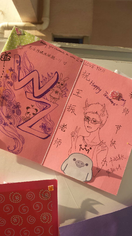 此次活动共四个年级参加,分别为初一、初二和高一、高二。学生会成员事先为一年级学生发放了贺卡DIY材料包,各个年级以小组的形式为每位老师精心自制了贺卡,为老师送去了一份真心实意的祝福。同时心理协会的成员积极组织二年级班长会议,大家集思广益,为老师准备了一堂不一样的班会课。松中的教师节,无处不洋溢着学生对老师的关怀和祝福。