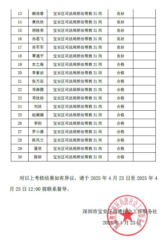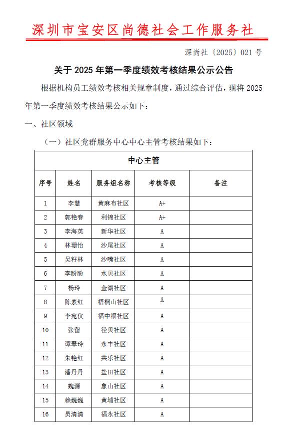 深尚社〔2025〕021号 关于2025年第一季度绩效考核结果公示公告