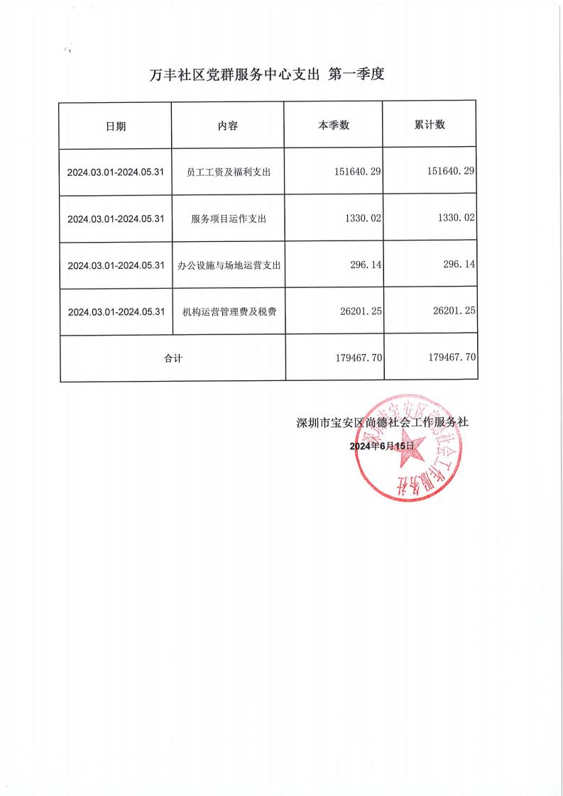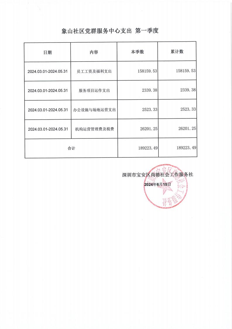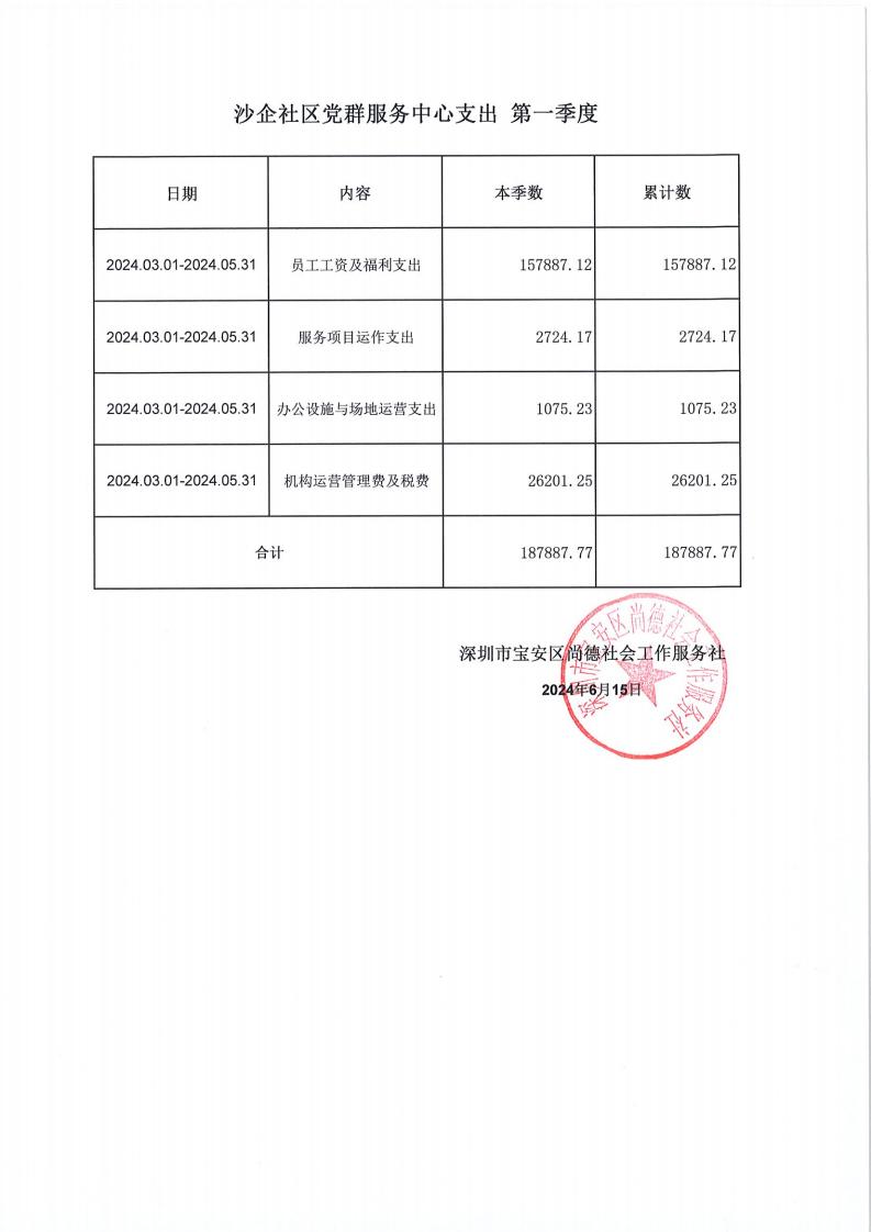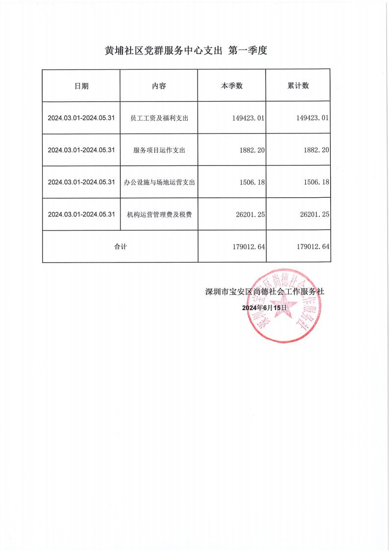 关于深圳市宝安区尚德社会工作服务社宝安区新桥街道黄埔、沙企、万丰、象山社区党群服务中心支出第一季度的公示