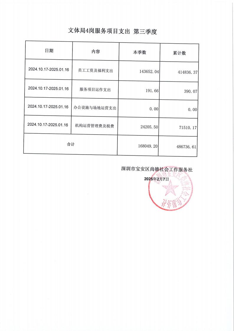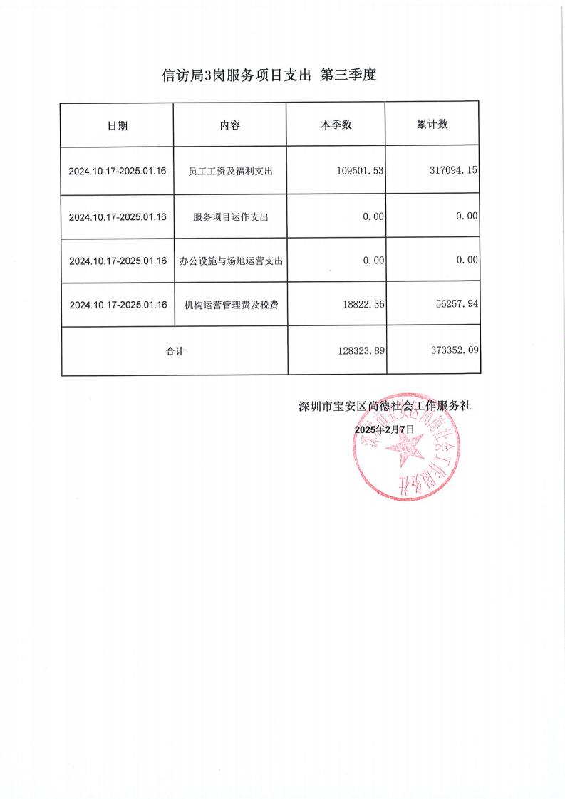 关于深圳市宝安区尚德社会工作服务社的宝安区购买社会工作专业化服务(信访局、政法委、卫健局、文体局)项目支出第三季度的公示