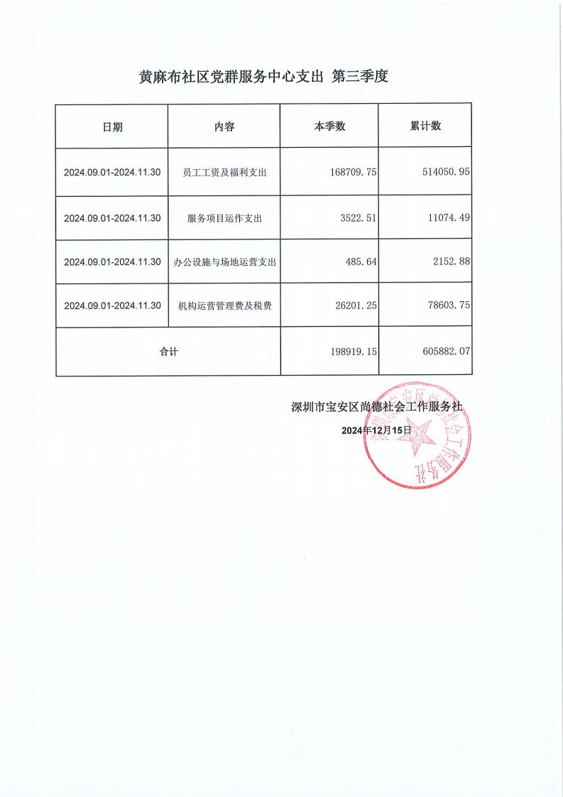 关于深圳市宝安区尚德社会工作服务社宝安区航城街道黄麻布、黄田、利锦社区党群服务中心支出第三季度的公示