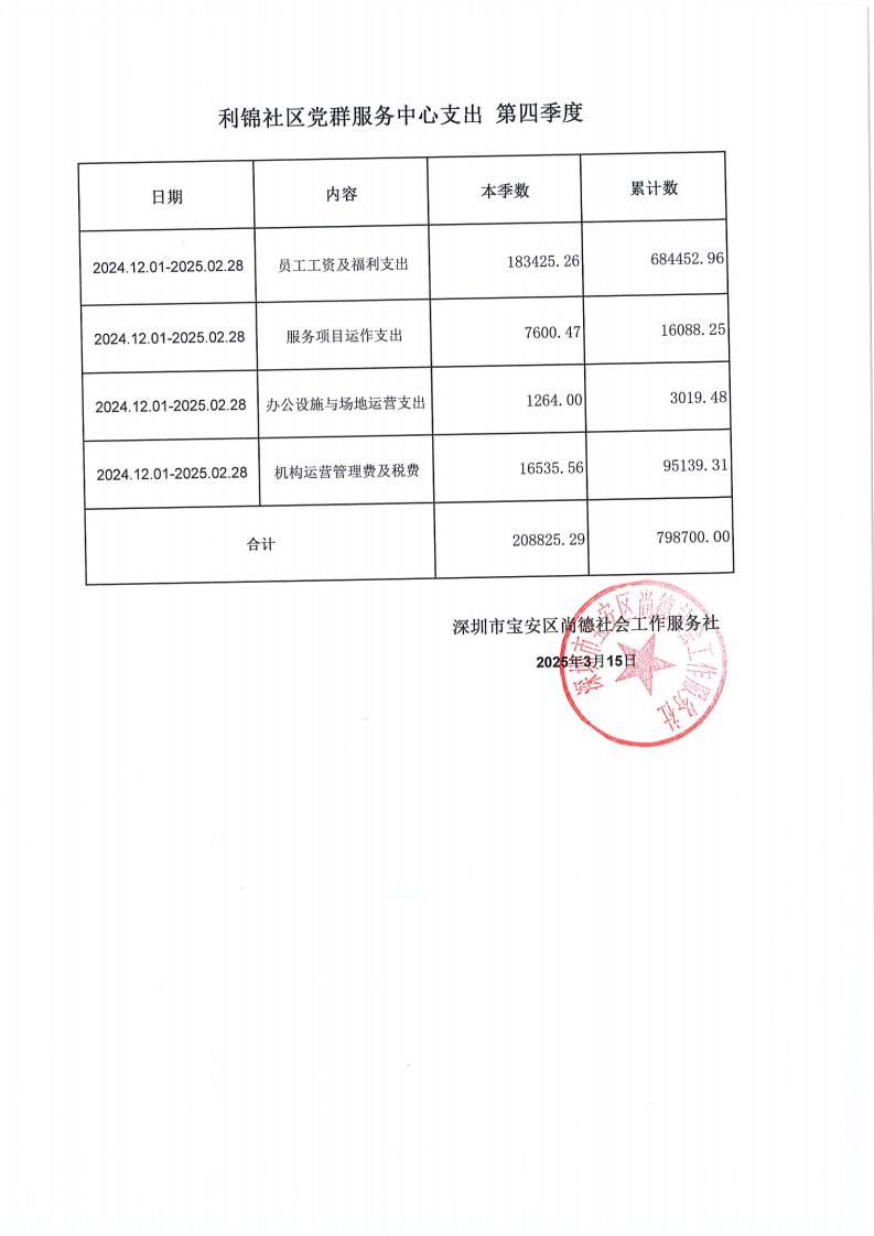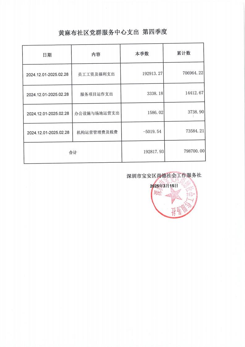 关于深圳市宝安区尚德社会工作服务社宝安区航城街道黄麻布、黄田、利锦社区党群服务中心支出第四季度的公示