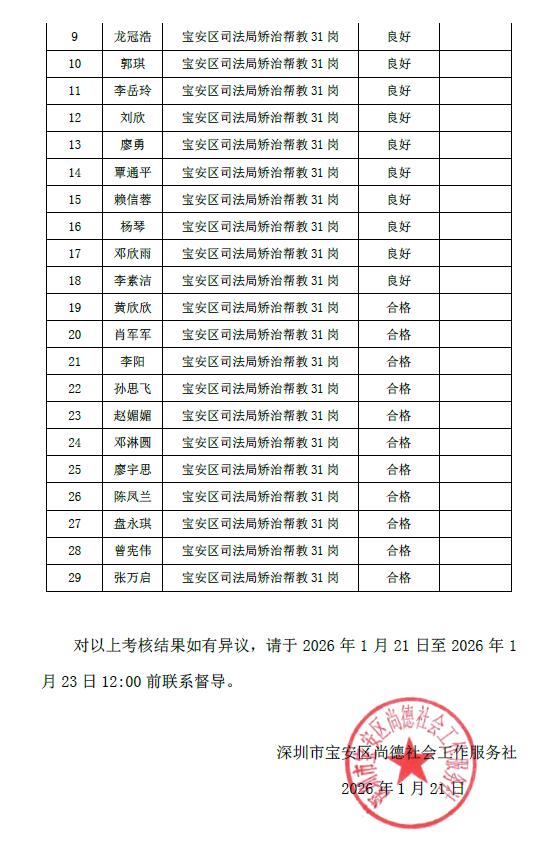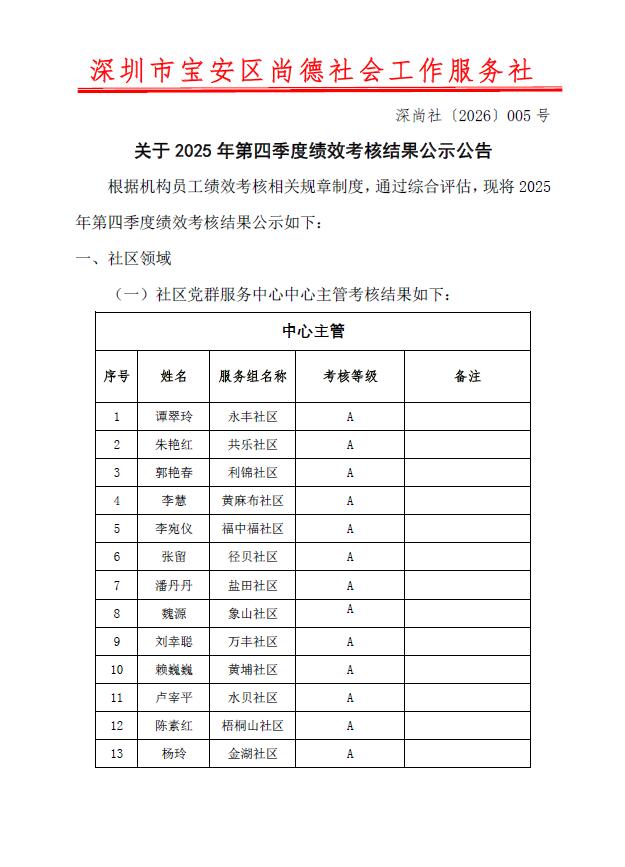 深尚社〔2026〕005号 关于2025年第四季度绩效考核结果公示公告