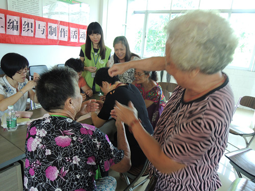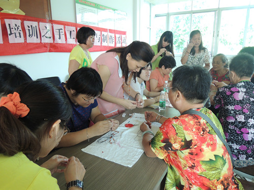 “老师,我眼睛看不见,你能不能帮我穿珠子……”这是发生在2013年9月13日下午玉器手工编织培训现场的一幕。此次培训由新澜社区服务中心、“青春家园”项目携手观澜成校向社区居民推出。活动吸引了社区妇女和残疾人朋友参与,80岁高龄的老奶奶也乐此不彼地加入到活动中。