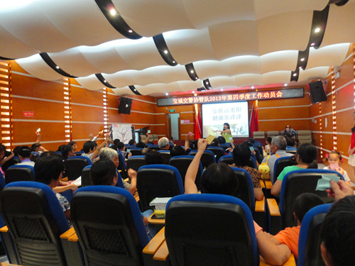 九点半活动正式开始。社工首先就活动的内容和目标向长者们进行了简单的介绍,近80名长者以举杯共饮菊花茶的融洽气氛和热烈的掌声迎来本次活动的第一个环节——“击鼓传花乐重阳”。在与社工简单的重温有关重阳的传说和习俗之后,长者们仔细观看了制作重阳糕的教程短片,并在击鼓传花中重温和巩固了重阳的相关内容和制作重阳糕的要领。在问题抢答环节中,活动的气氛逐渐推高,接下来社区长者带来精彩的太极拳和太极剑表演更是赢得阵阵掌声。活动期间长者不忘在手中的心愿纸上写下自己的“心声”,其中包括长者们的需求和对中心提供服务的建议和意见等,在社区社康中心为长者提供和发放完健康咨询的读本之后,到场长者积极有序地上前将手中写满“心声”的心愿纸粘贴在“心声话我知”的心愿树上,场上气氛再次推高,最后上午的重阳活动在大合照的欢笑中结束,离开时长者纷纷感谢社工义工给他们带来一上午的温馨和幸福。