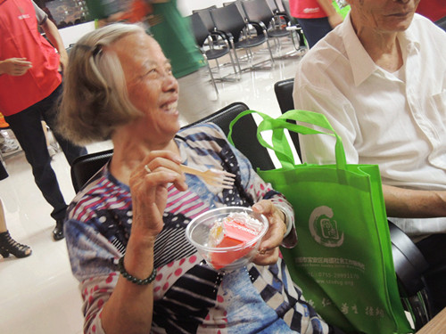 活动中,首先由社工向在场的社区老年人简单介绍了新澜社区服务中心的发展情况。随后,客家山歌手陈先生清唱的一首客家山歌拉开了老年人KTV的序幕,在陈先生的带动下,在场的老年人都争先恐后地上台表演自己的才艺,引得下面的观众都拍手叫好,有的还高喊“再来一首”。接着,社工与义工朋友将准备的蛋糕分给在场的每一位老人,并与大家一起唱起了节日快乐歌,老年人的脸上压抑着快乐和满意的笑容。最后,社工还准备了趣味大抽奖游戏,为幸运的老年人送去助老月的祝福,得奖的老人拿到了奖品后,脸上乐开了花。