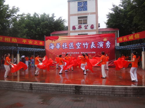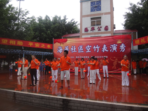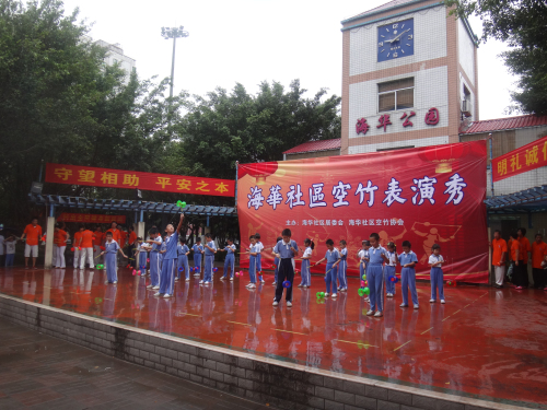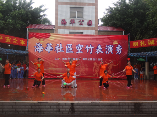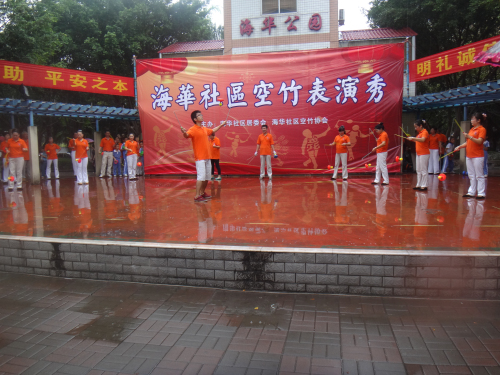 2013年11月10日,上午9点,海华社区的公园内展开了一场抖空竹的表演秀,海华社区空竹辅导站的学员们经过数个星期的训练,今天终于站在了舞台上。本次空竹文艺汇演不仅仅是为了本年度空竹辅导站的培训画上一个句号,更是让学员们展示自己多日以来的培训成果。自海华社区空竹辅导站成立以来,越来越多的居民加入到抖空竹的行列,到目前为止已经有将近五十多位社区居民加入到了海华社区空竹表演队伍当中。