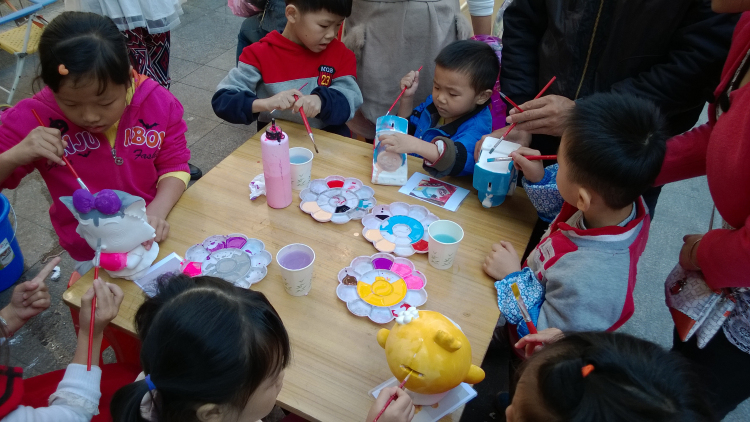 活动当天包括4名小义工在内一共有8名义工参与此次奉献爱心的活动,本场活动一共包括四个部分,第一部分为邀请社区居民及来深建设者将石膏进行现场上色处理。现场有很多并未涂上任何颜色的石膏坯,其中以各种动物的卡通造型为主,小朋友对给石膏涂上五颜六色的颜色非常感兴趣,如果想要给石膏涂上颜色并带回家需要捐款15元,在感受到自己动手涂颜色的快乐的同时也奉献了爱心,而所得义卖款项将归入慈善帮扶协会的慈善基金来帮助更多需要帮助的人。第二部分为来深建设者及社区居民将自己的闲置物品进行义卖,参与义卖的物品种类繁多,包括家用电器(例:电饭锅、电饭煲等),衣物,工艺品,收藏品,玩具,生活用品(例:小板凳、洗漱架等)。作为义工的季阿姨也把自己家中闲置的电饭锅拿出来义卖,她说:“我自己力所能及的帮到大家,把我家里不用的电器拿到这里义卖既让有需要的人低价买到了合适的物品,又能够将义卖得到的钱去奉献爱心,那何乐而不为呢。”活动现场还有很多像季阿姨这样乐于奉献又乐于助人的热心市民。