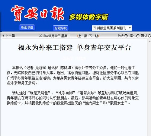 塘尾社区为青年劳务工开展的交友相亲活动在宝安日报上刊登。