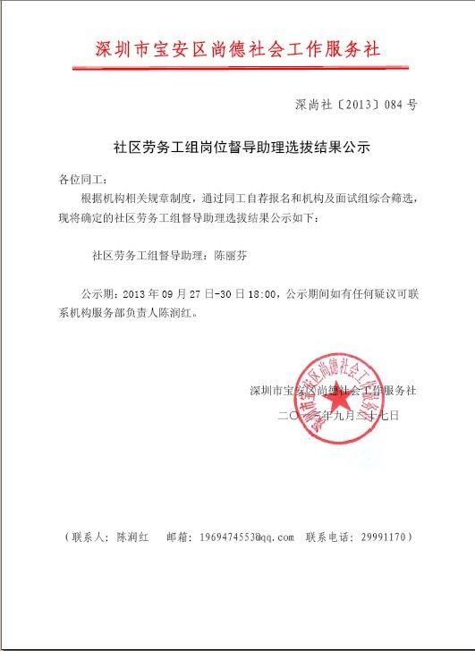 社区劳务工组岗位督导助理选拔结果公示