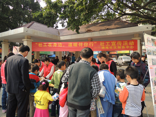 为配合深圳市社工宣传周主题活动,3月22日下午,塘尾社区服务中心在塘尾广场开展了一场名为“社工在身边,温暖伴你行”的社工宣传活动。