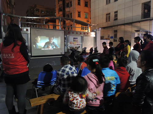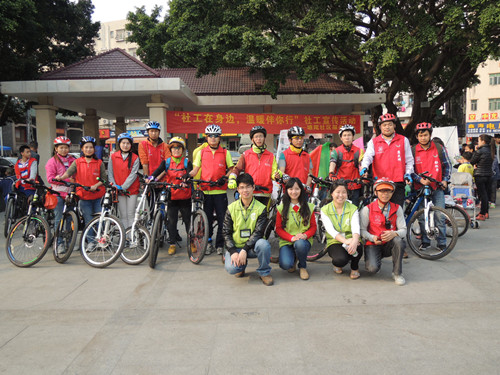 此次活动还邀请了福永骑行队的参与,骑手们将社工标识的小彩旗绑在车上在塘尾大街小巷中穿行,十分惹人注目。当天晚上,塘尾社区服务中心还在塘尾十一区放映了社工宣传短片和社工题材的电影,吸引了众多居民观看。