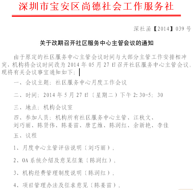 关于改期召开社区服务中心主管会议的通知