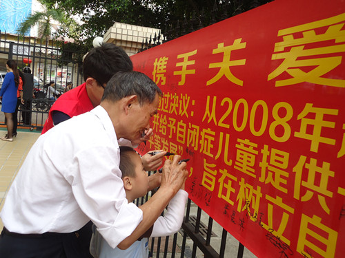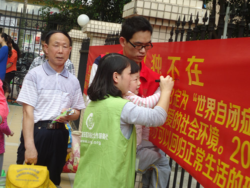 此次活动共分为3个环节,观看自闭症知识展板、亲子互动游戏及横幅签名纪念。亲子互动环节,老师引导小朋友和家长进行互动,在互动过程中,让家长了解孩子的特点,发现孩子的不足。为了吸引居民观看活动知识展板,社工采取知识问答的方式,引导居民通过观看活动展板,回答相关问题,从而了解自闭症知识。居民对此表现的很积极,很认真的观看知识展板,遇到不懂的,则主动询问旁边的居民或者社工。横幅签名环节,居民也表现的很积极,通过横幅签名,表达自己对社区自闭症儿童的祝福。