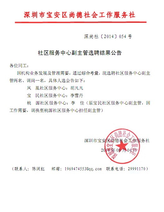 社区服务中心副主管选聘结果公告