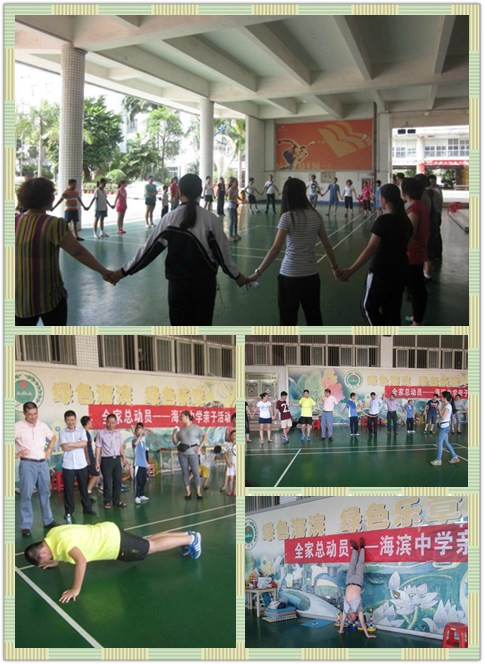 “快点、快点,要追上了”, “呼啦圈快点,再快点”,“先过头,再过脚”,呐喊声、欢呼声充满了周六的校园,这是在干什么?走近一看,原来是海滨中学“全家总动员”亲子活动正在紧张的上演。