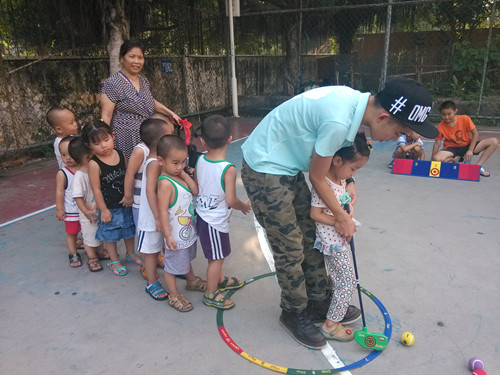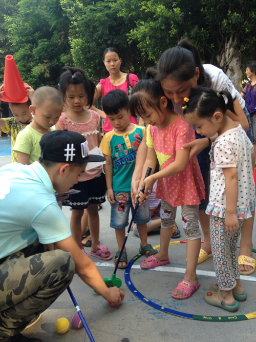 4.工作人员教孩子们体验斯耐克高尔夫