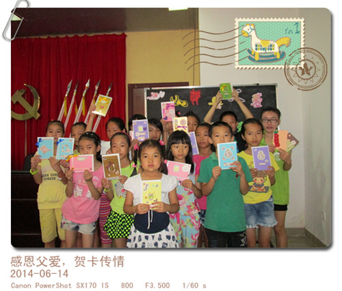 6月14日早上,十几个孩子早早在等候着活动的开始,此次活动以观看视频—《让世界充满爱—爱父母》结合亲自动手制作贺卡的形式开展。虽然孩子们都还小,但是情到深处也落泪,孩子们都很认真的看完了视频。其实不仅父亲爱我们,我们对父亲的爱有时候也会因为父亲的严厉而怯于表达。看完视频后,协助孩子们及时调节情绪,然后纷纷怀着对父亲的爱,制作着包含爱的精美贺卡,每个人都很认真的制作,希望能够把最漂亮的贺卡送给自己的父亲,并在贺卡上写下对父亲想要说的话。
