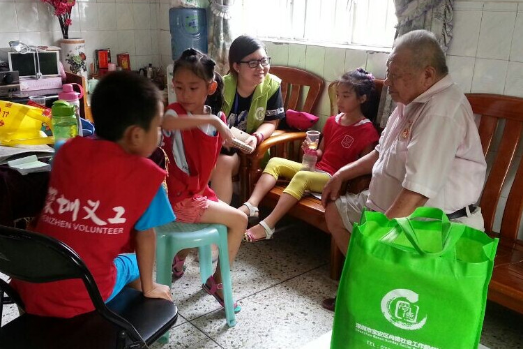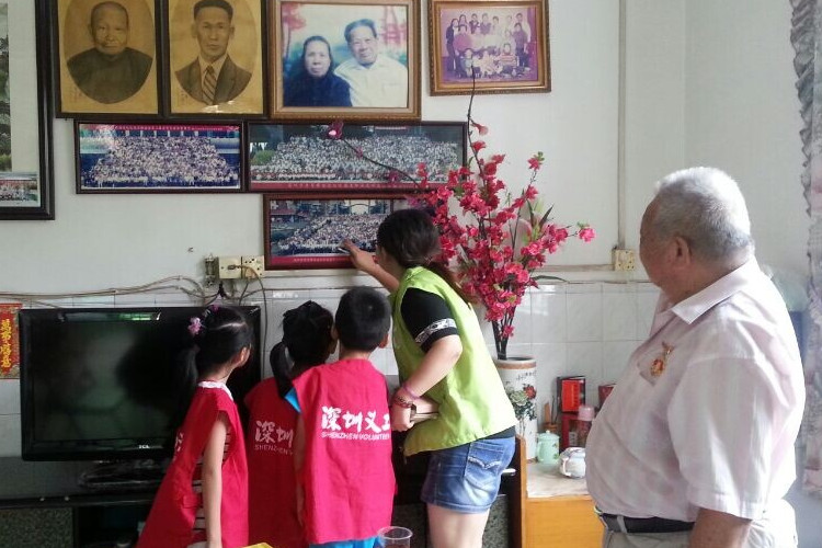 八一建军节是为了纪念中国人民解放军,小义工队伍为了向曾经保家卫国的退伍军人献上一份祝福与关爱,他们用小小的身躯抗着烈日,分成三组来到了退伍军人们的家中。其中一位东江纵队老战士沈国香老爷爷看到他们汗淋淋的样子,不禁感叹:“这群小朋友太乖巧了”,并露出了怜爱的笑容,紧紧的拉着孩子们的手,让他们坐到自己的身边,开始说起了当年在这里发生的故事。