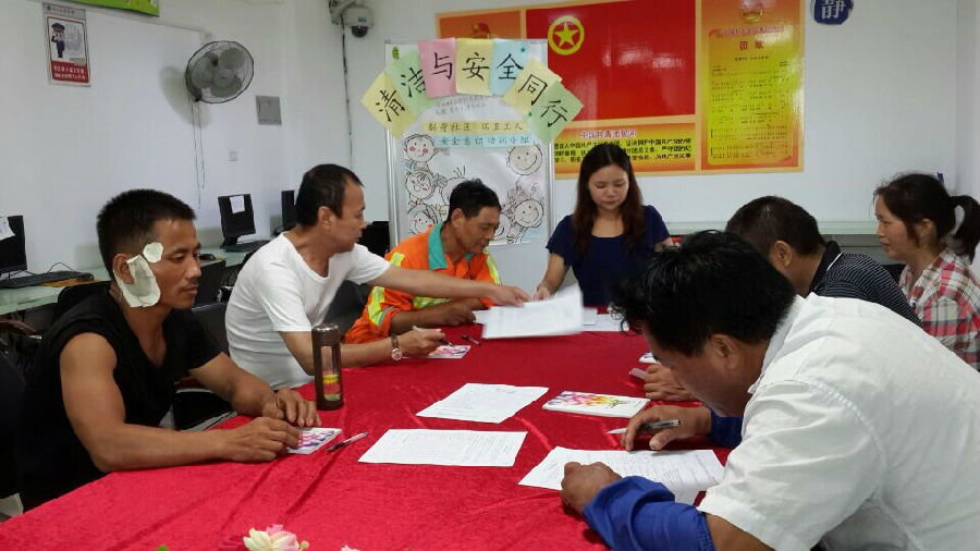 环卫工人是城市的美容师,他们为了社区的整洁和干净在默默挥洒着自己的汗水,从早上5时到晚上18时,无论是暴晒还是下雨,他们都在路面上清扫着。他们获得的社会知识途径极少,一般都是二点一线,在媒体的报道中能听到各种关于他们的新闻,因不懂防骗,被电话诈骗,ATM机上转账给骗子;因缺少安全的意识,马路上工作时被汽车碰撞……2014年7月,为了搭建一个社区的支持平台,为了表达对环卫工人的关怀和敬意,翻身社区劳务工权益服务中心开展了“清洁与安全同行”—环卫工人安全意识培训小组。