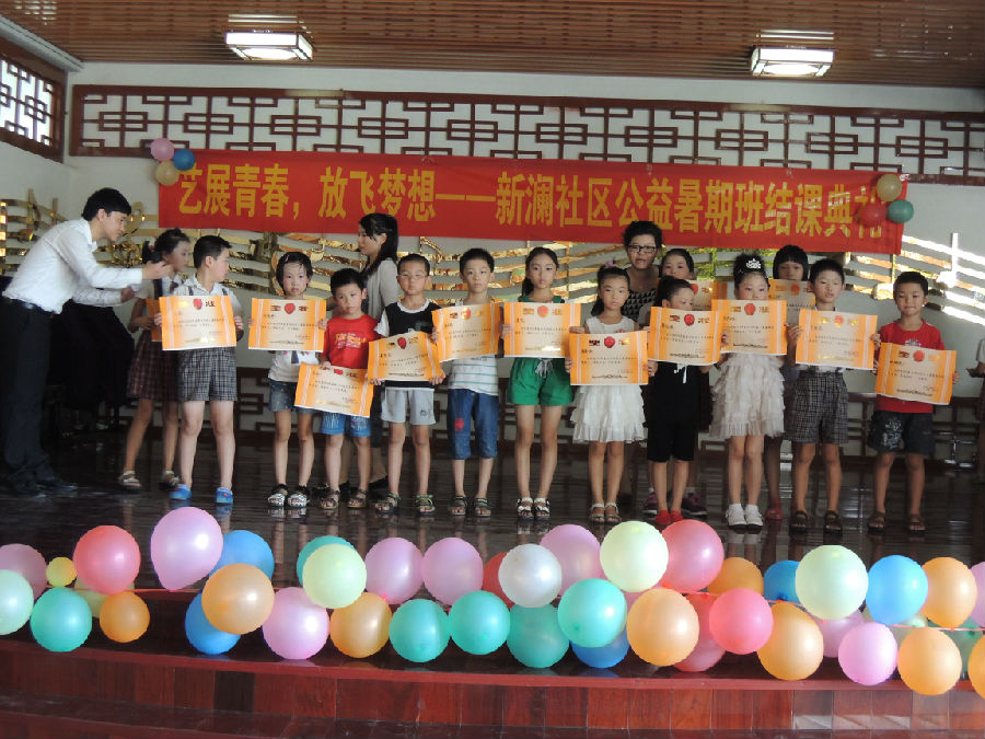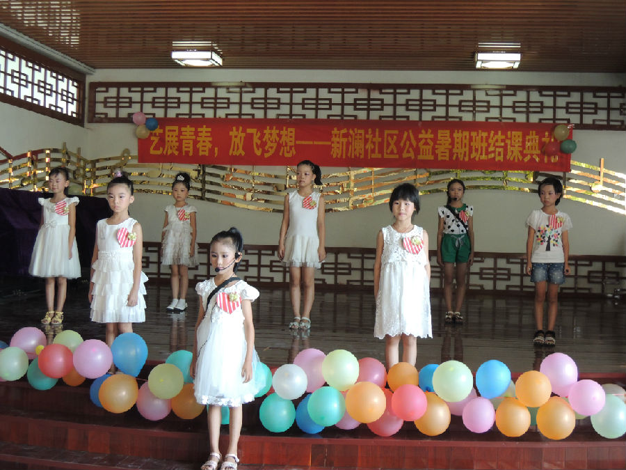 2014年8月24日,下午三点,“艺展青春,放飞梦想”——新澜社区公益暑期班结课典礼在中心小学博学厅圆满结束!本次的暑期结课典礼通过一个文艺汇演的表演形式来结束。通过为期一个月的公益暑期班的训练,小朋友们终于在今天站上了舞台,给社区的居民及家长展现了培训的成果,看着自己的孩子站在舞台上,家长们感触良多,对社工们及培训中心老师表示非常感激。