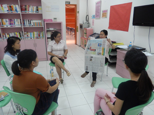 图1 赖晓燕老师引导大家团队协作站在最小片报纸上