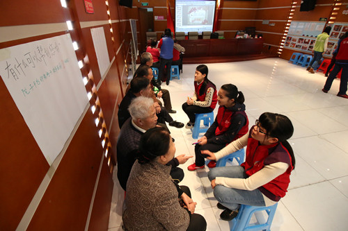 活动开始时,义工主持人向参与者介绍了本次生日会的内容和流程,将参与者的状态慢慢调动起来,并以“十巧手(手指操)”的小热身环节,活跃了现场的气氛,每一位寿星都很认真地跟着健康顾问做每一个动作。在“动一动、说一说”游戏中,社工让寿星们分组,由每组的第一位寿星根据抽中的名词卡对第二位寿星做相对应的动作,这样一个一个通过肢体动作传下去,由最后一位寿星猜出是什么名词。游戏开始前,社工先通过“你好”让每组成员作了简单认识,简单的say hi摆手动作打破了组员之间的尴尬,游戏中充满了欢声笑语,有些组员还把动作做得特别搞笑,旁边的组的组员看得哈哈大笑。“动手动脚”的环节增加了寿星们的锻炼的次数,也为湿冷的天气捎来了一缕缕的暖意。