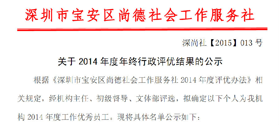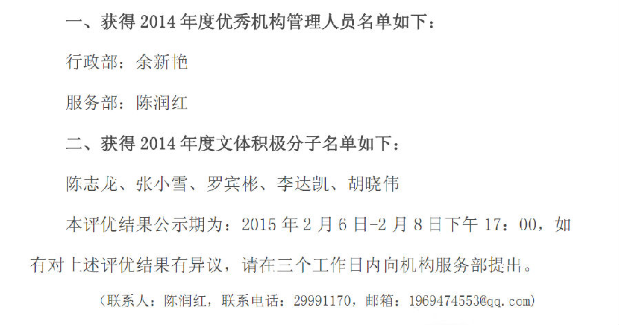 关于2014年度年终行政评优结果的公示