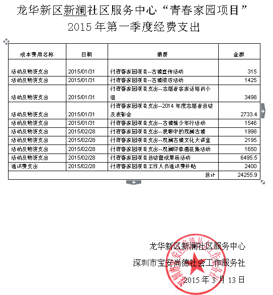 龙华新区新澜社区服务中心“青春家园项目” 2015年第一季度经费支出