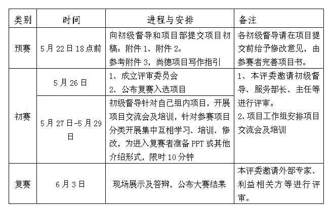 为加强机构服务的项目撰写和开发能力,并不断完善机构现有服务项目,同时加强同工的项目设计能力及管理推广能力,机构拟于2015年6月3日(周三)下午14时举办第一届尚德社工项目大赛。本届项目注重项目创新点、项目实施效果、过程培养、公众参与程度。