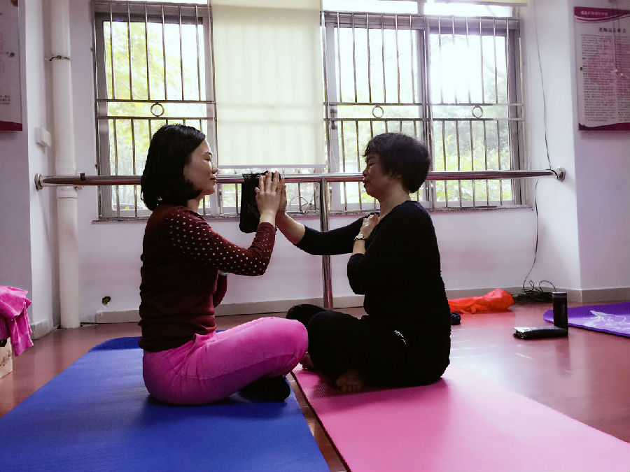 瑜伽郑老师先带领学员聆听瑜伽的轻音乐,一同进入宁静的冥想世界,调整呼吸,随后则从简单的瑜伽动作开始练习,让她们慢慢适应。老师在练习过程中强调学员需要按自己身体承受能力慢慢拉伸,切忌挑战自己的极限。由于这次是面向无基础学员,郑老师细心的慢慢教导学员一步步的学习不同动作,让她们慢慢领略瑜伽之间的奥妙。