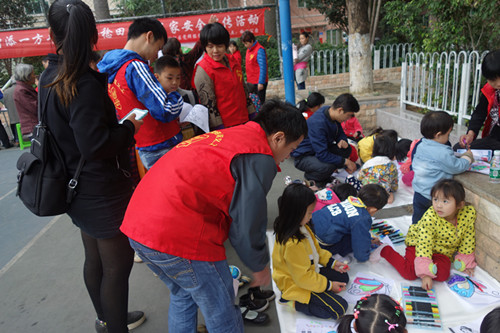 2.小朋友们在涂色,爷爷奶奶安心接受居家环境安全调查。
