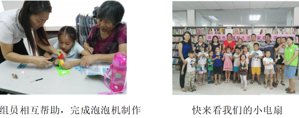 本次小组主要围绕废物利用、科普小实验来增进组员对环保概念的新认识。家长和孩子们用自己灵巧的手,用矿泉水瓶、旧电池、包装袋,冰糕棍等,通过拼、剪、折等形式,制作出了一件件精美、有创意的作品,比如DIY吸尘器、泡泡机、电风扇、小台灯等,在利用废品的同时教育了孩子要增强日常的环保意识及发挥想象力。家长和孩子们纷纷参与其中并称赞不已,其中妞妞的家长高兴地说:“社区举办这个活动,家长们很高兴,可以把我们聚在一起沟通交流,我们就像一个和谐的大家庭,更增进邻里间的交流了。”