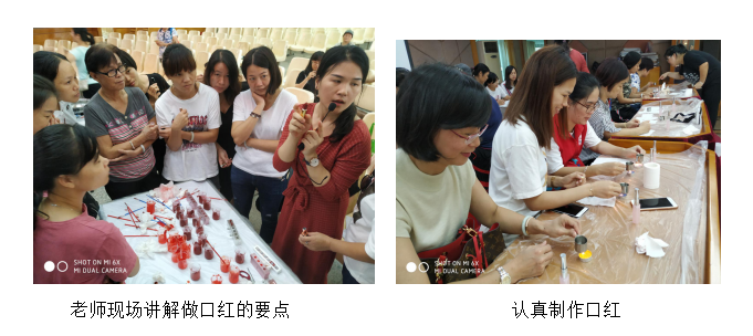 活动当天,大家都早早来到了活动现场,正式开始后,社工首先让在座的各位社区妇女对对面的女性说声“哇!你真的好漂亮!”,以提高自己的自信心,再简单介绍了口红对于女人的意义,口红对于肤色及人的气色有着极大的提升。在讲授的过程中,社工还为参与者们传授了社交的技巧。活动中,社工首先向学员分发制作口红的材料,接着一边讲解一边示范制作过程,组员们一个个都听得聚精会神、津津有味。轮到大家制作的时候,搅拌、倒模、隔水加热、倒模……学员们对每个步骤都一丝不苟、力求完美,不明白的地方还积极向社工提问。等到口红脱模成功制作完成的时候,组员们欣赏着自己的作品,脸上露出了灿烂的笑容。等到口红全部制作完成后,社工特意提醒参与者,制作完的口红不能马上使用,要先放进冰箱冷冻层冷冻2小时后再拿出使用,否则会折断口红。