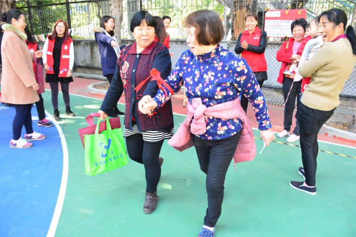 在活动方面,社区居民在工作人员的指引下有序排队领取游戏券并参与游戏,其中“二人三足”游戏深受居民的喜爱,该游戏两人一组,用一根绳子绑住两人的各一只脚,并完成一段距离行走,非常考验参与者间的默契,活动现场也出现各种组合,有“爷孙组合”、“闺蜜组合”以及“老伴组合”等。一边完成游戏,一边向周围围观的居民打招呼,活动现场氛围热烈、场面非常热闹。