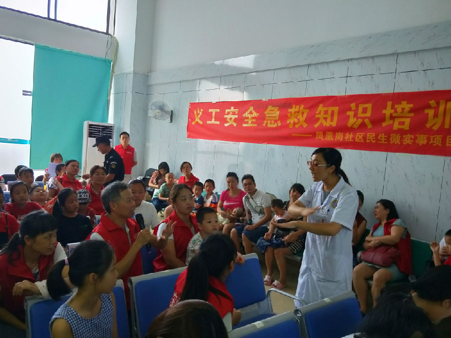 2018年7月17日,凤凰岗社区党群服务中心社工联合社区社康医院的医生在凤凰岗社区健康服务中心开展了一场“义工安全急救知识”的培训,活动吸引了30多名义工亲子家庭及个人参加。他们在活动中学习了在遇到危险困境时应该如何应对的知识及技巧。同时,社康的医生以问答的方式,巩固义工朋友对急救知识的要点,增加与他人的互动。