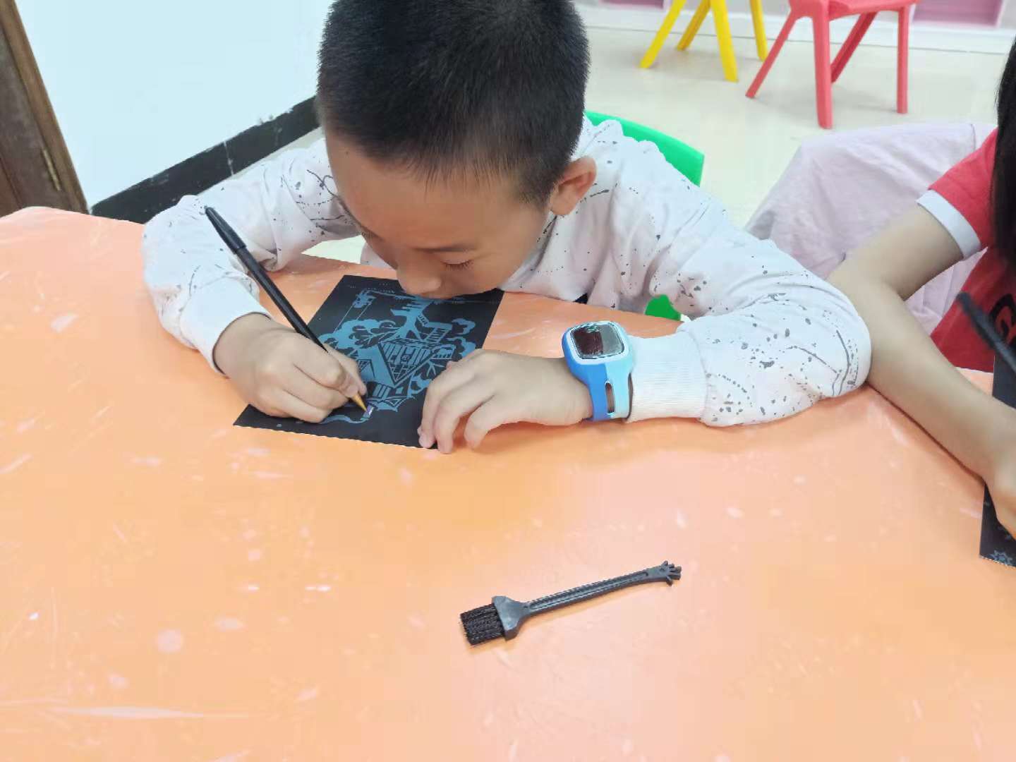 活动开始,社工给小朋友们发放刮画工具,并详细讲解了手绘刮画的技巧,并将已完成的刮画图案展示给大家,为他们创作提供灵感。大家就迫不及待的动起手来,刮去上层的黑色便露出了下面的彩色。“哇,好神奇!只听见竹笔在纸上刮擦的声音,大家见“黑纸”变成了“彩画”,纷纷称手中的竹棒为“魔法棒”,可以用它变出多姿多彩的世界。瞧!一支支竹笔替在孩子的手中不停的挥舞,一幅幅美丽、富有灵性的作品便呈现在我们面前了。